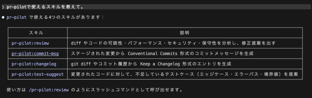 収録したプラグイン(pr-pilot)の機能は、「PRに関わるコードレビュー・変更履歴・コミットメッセージ・テスト提案を、引数なしのスラッシュコマンドひとつで自動生成できる」というものです。