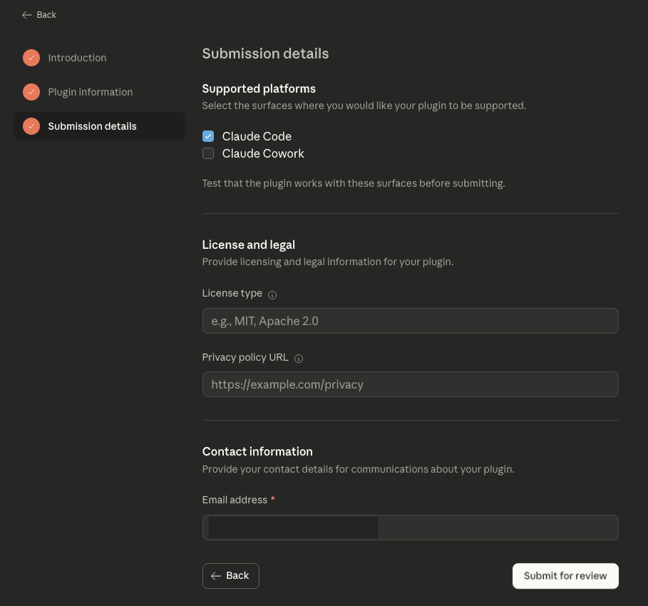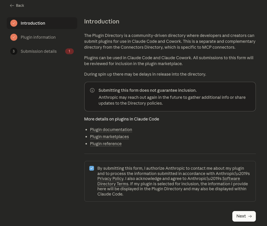- 申請フォーム(https://platform.claude.com/plugins/submit)に移動