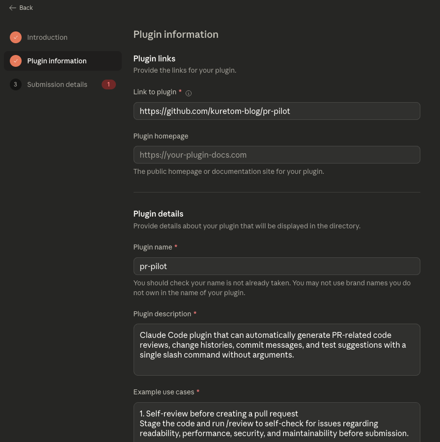 GitHubのURLとプラグインの詳細情報(名前・説明・ユースケース)を入力します。