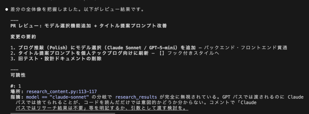 - /pr-pilot:reviewでセルフレビュー → 指摘を修正
