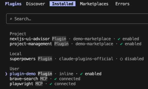 以下のように、InstalledのUserスコープに.claude-plugin/plugin.jsonで定義したnameフィールドと同じ名前が表示されていて、enabledになっていれば読み込みが成功しています。