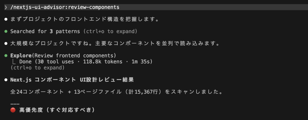 また、nextjs-ui-advisorの部分は、.claude-plugin/marketplace.jsonで定義したpluginsフィールド内の nameフィールド(プラグイン名)を入れます。