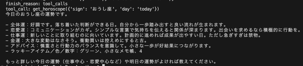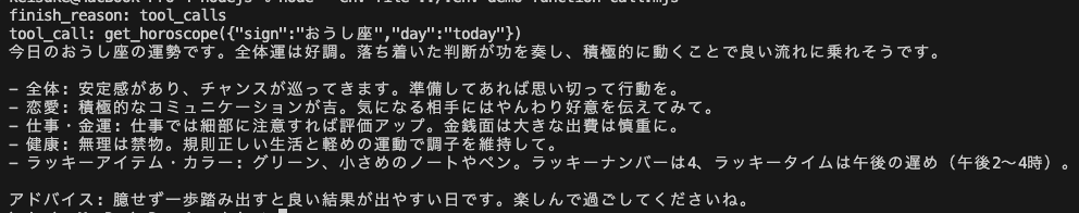 tools変数(関数定義):モデルへ渡すツール定義の配列です。サンプルではtoolsにget_horoscopeの定義を入れています。