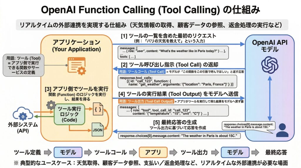 OpenAIのドキュメントでは過去に「Function calling」と呼ばれていた仕組みが、より広い概念として「tool calling(ツール呼び出し)」と表現されるようになっています。