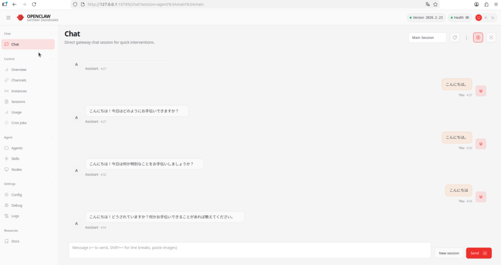 - Control UI(Dashboard):ブラウザ上でチャット送受信や設定確認ができる管理画面です。