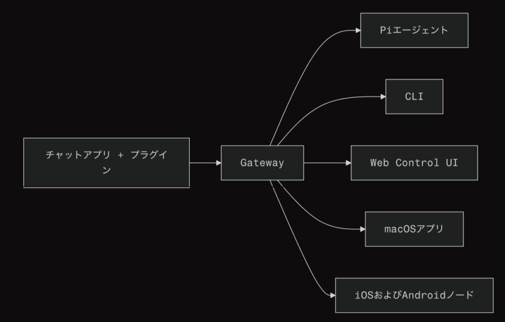 - CLI(openclaw):セットアップ、オンボード、チャネル管理、Gatewayの制御などを行う操作インターフェースです。
