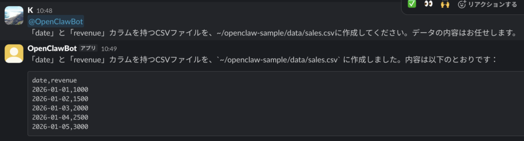 「date」と「revenue」カラムを持つCSVファイルを、~/openclaw-sample/data/sales.csvに作成してください。データの内容はお任せします。