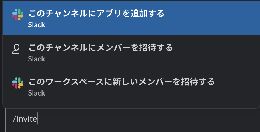 Slackチャネル側では、/inviteをテキストボックスに入力して、「このチャンネルにアプリを追加する」を選択します。